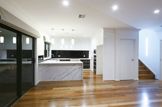 The mini LED lights over vanities are only 1 watt each and also provide 50,000 hours of Lumen light. Unlike conventional down lights these LED lights do not heat up in the ceiling space and therefore do not overheat. The bedroom lights can also be dimmed by touching the bottom of the light fitting.